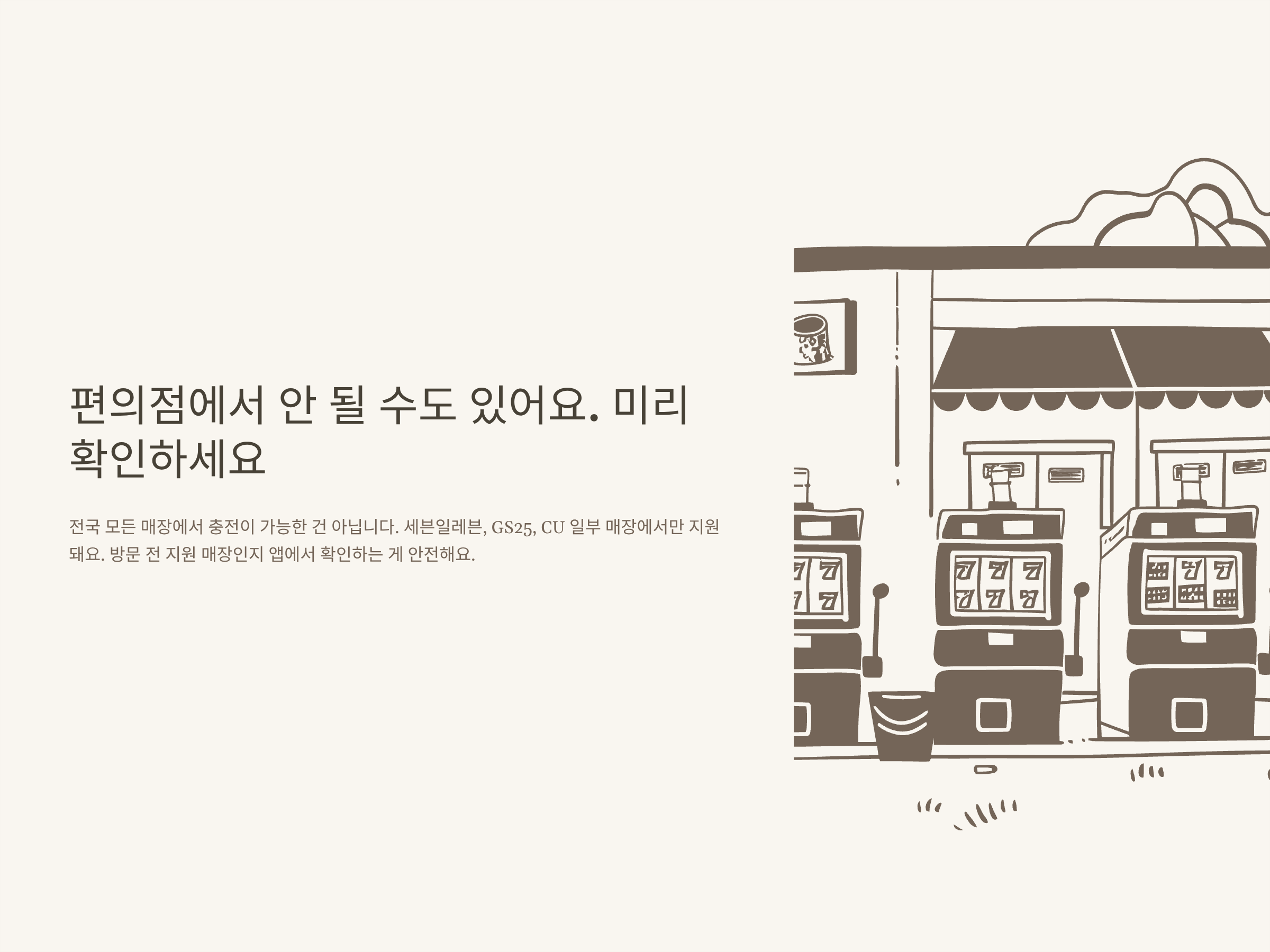 | 지하철역 | 일부 역 내 충전기/편의점 이용 | 일부 지역만 지원 |