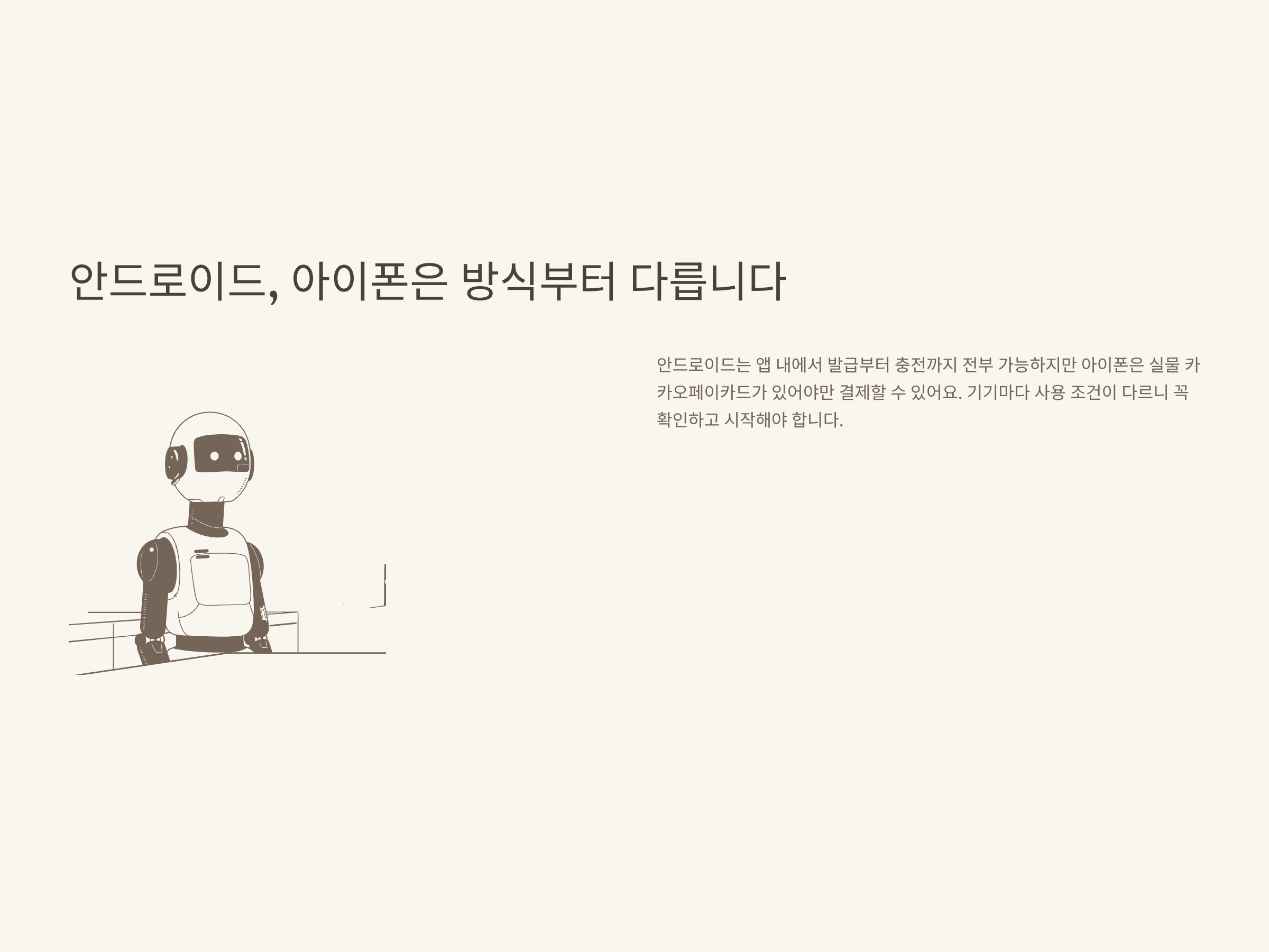 | 아이폰 | 실물 카카오페이카드 연동 | 모바일 교통카드 미지원, 실물로만 결제 |